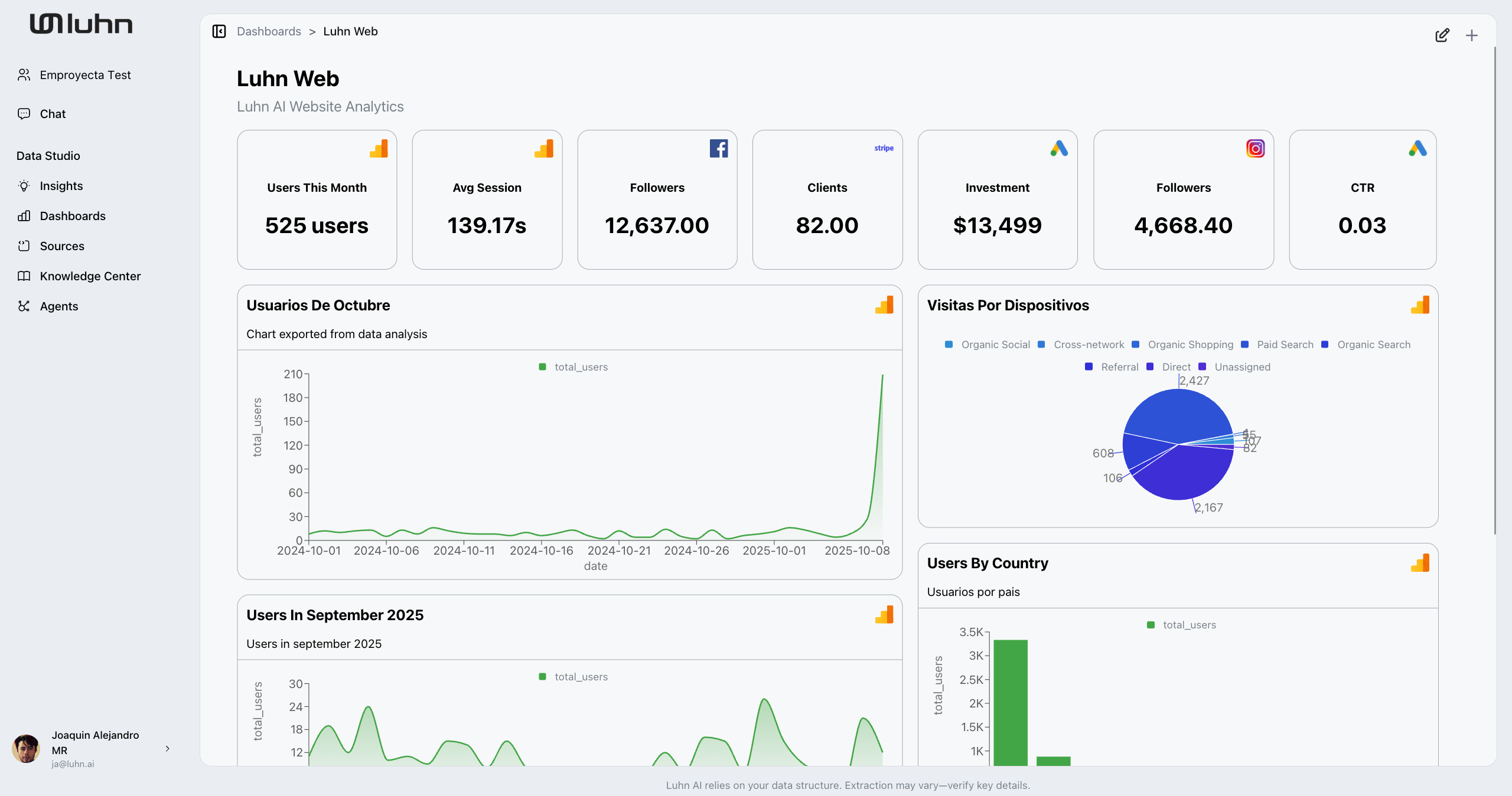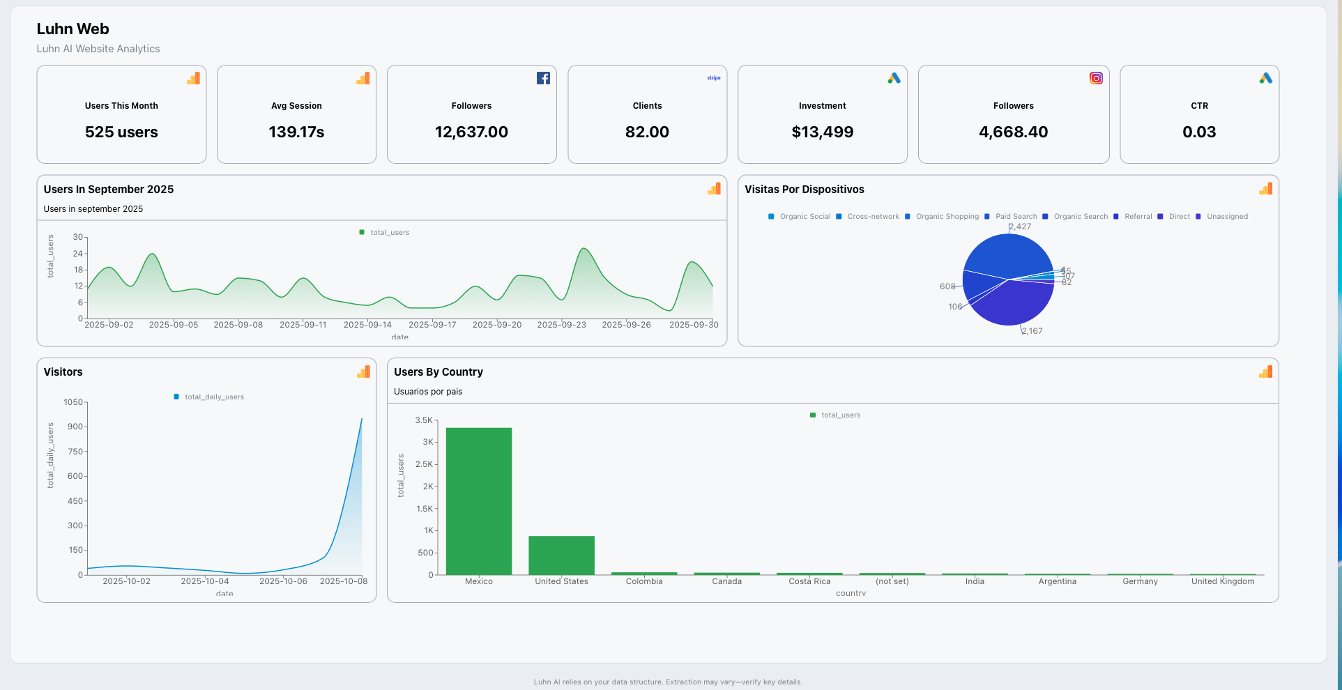 Luhn AI conecta los datos de tu empresa o cliente (Meta, Google Ads, Analytics, TikTok, Salesforce y muchos más) para generar reportes personalizados listos para compartir con un link.